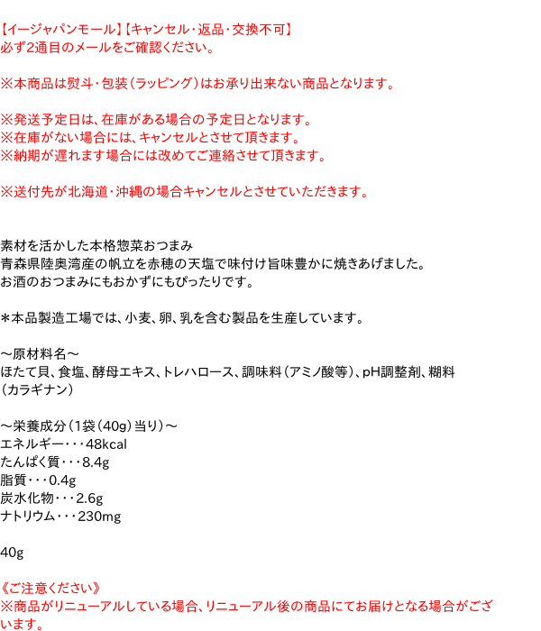 〜原材料名〜 ほたて貝、食塩、酵母エキス、トレハロース、調味料(アミノ酸等)、pH調整剤、糊料(カラギナン) 〜栄養成分(1袋(40g)当り)〜 エネルギー・・・48kcal たんぱく質・・・8.4g 脂質・・・0.4g 炭水化物・・・2.6g ナトリウム・・・230mg 40g【広告文責】株式会社イージャパンアンドカンパニーズ 072-875-6666《ご注意ください》 ※商品がリニューアルしている場合、リニューアル後の商品にてお届けとなる場合がございます。
