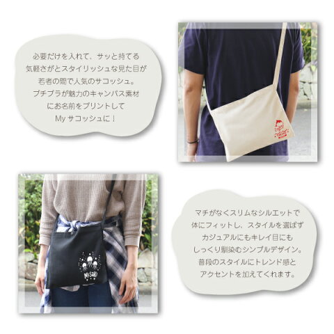 ● サイズ 平置き採寸(約): 横幅:30cm 高さ:23cm 持ち手:105cm ● 素材 サコッシュ:綿100% ● 名入れについて 注文画面の備考欄へご記入ください。