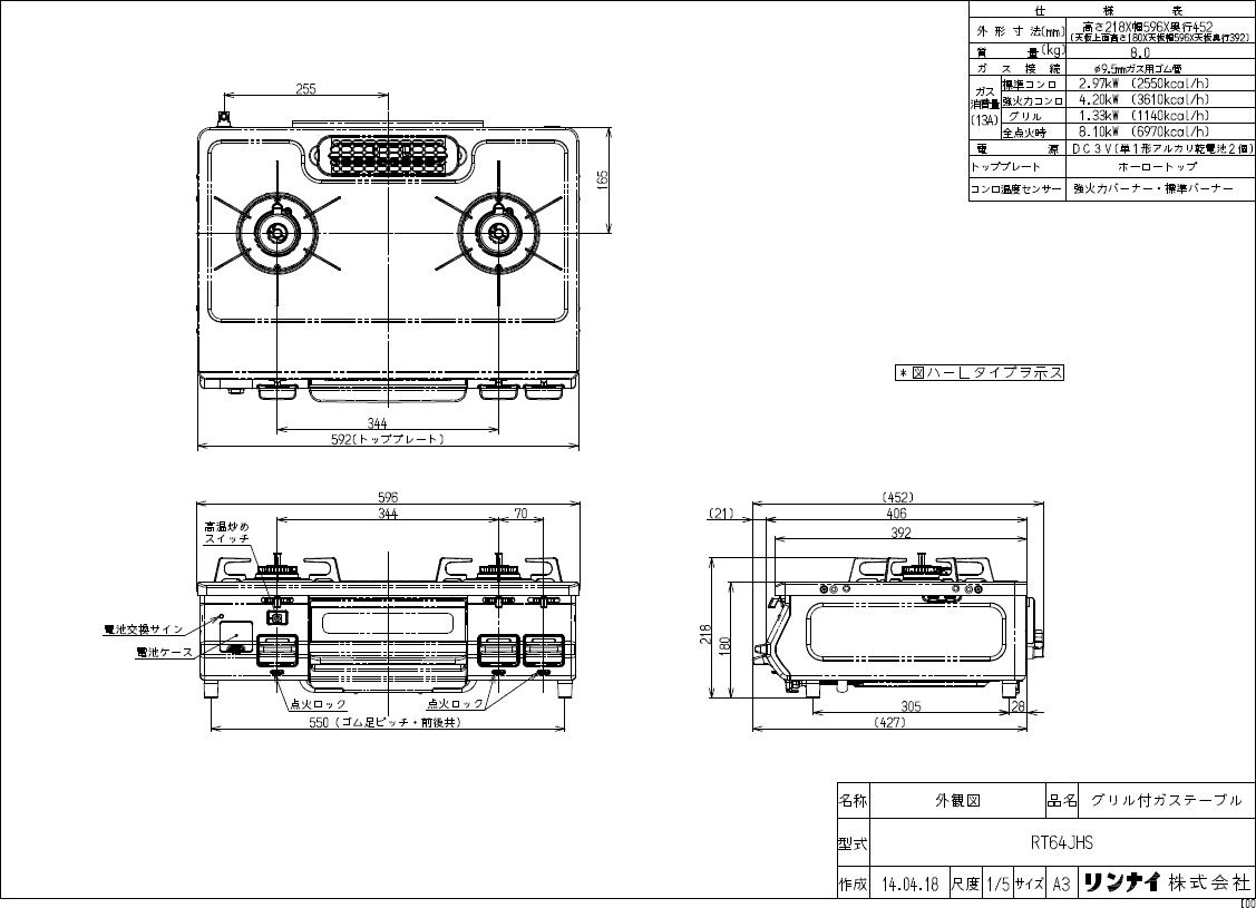 外形寸法:H218mm×W596mm×D452mm トッププレート素材:クリスタルコートトップ 質量:8kg ガス接続:直径9.5mmΦガス用ゴム管 使用電源:DC3V(単1形アルカリ電池2個) ガス消費量:13A/全点火時8.10(6970)、高火力バーナー4.20(3610)、標準バーナー2.97(2550)、グリルバーナー1.33(1140) LPG/全点火時8.00(0.571)、高火力バーナー4.20(0.301)、標準バーナー2.97(0.213)、グリルバーナー1.33(0.095)