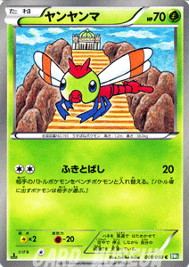 ■収録:BW5拡張パック「リューズブラスト」 ■カード名:ヤンヤンマ ■HP:70/タイプ:草 ■弱点:雷×2/抵抗力:闘-20/逃げる:1 ■分類:たねポケモン 《ヤンヤンマ》→《メガヤンマ》 ■ワザ ●無無:ふきとばし ダメージ:20 相手のバトルポケモンをベンチポケモンを入れ替える。